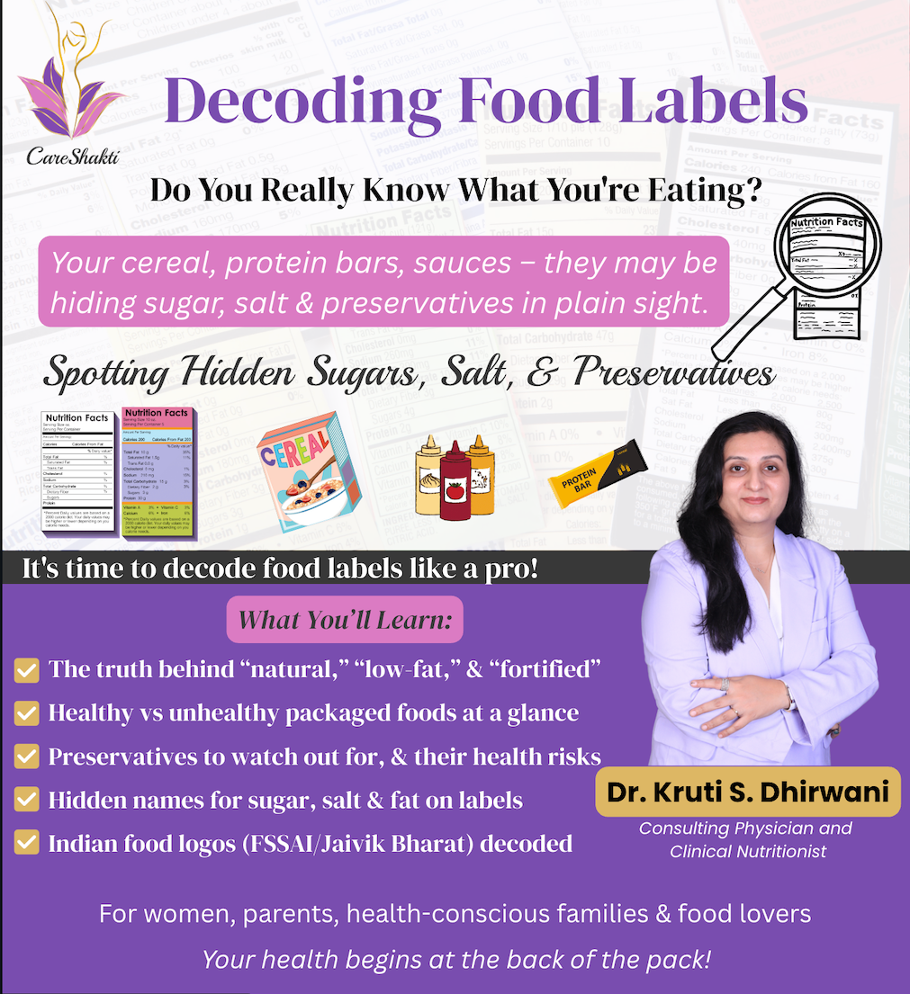 CareShakti and the speaker, Dr. Kruti S. Dhirwani, do not endorse, promote, or defame any specific food brands, products, or companies. Any food labels or product images shown during the webinar are used strictly for illustrative and educational purposes only.